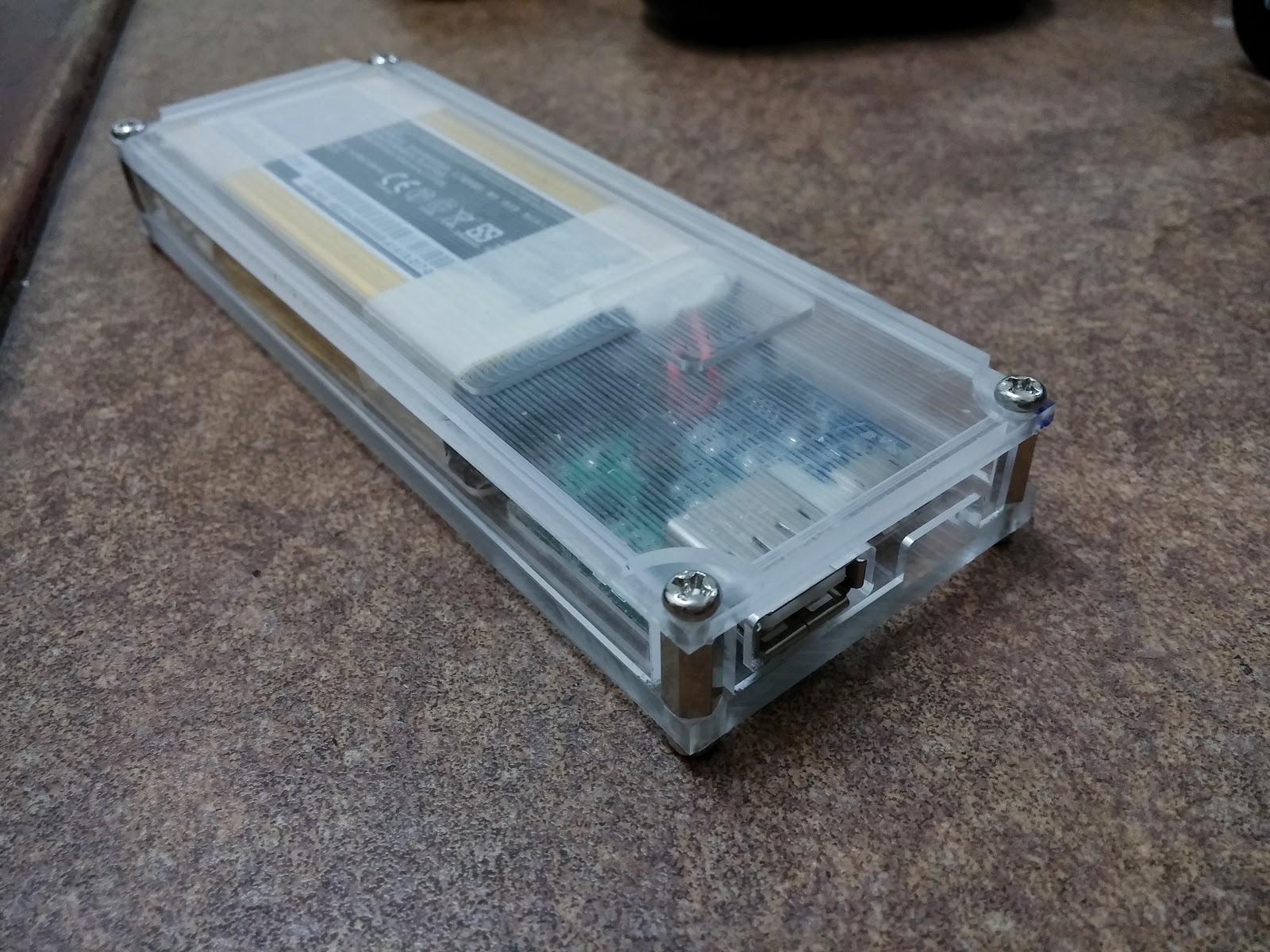 由於電池膨脹變型且無法充電,目前已經將電池拆除並使用外接電源